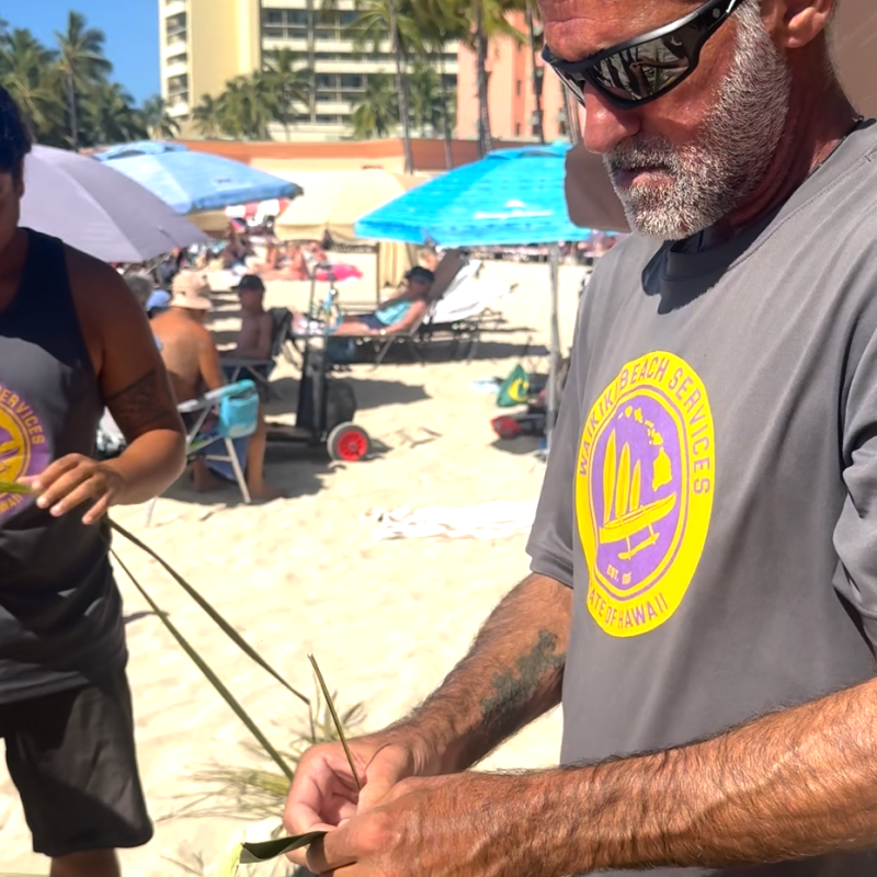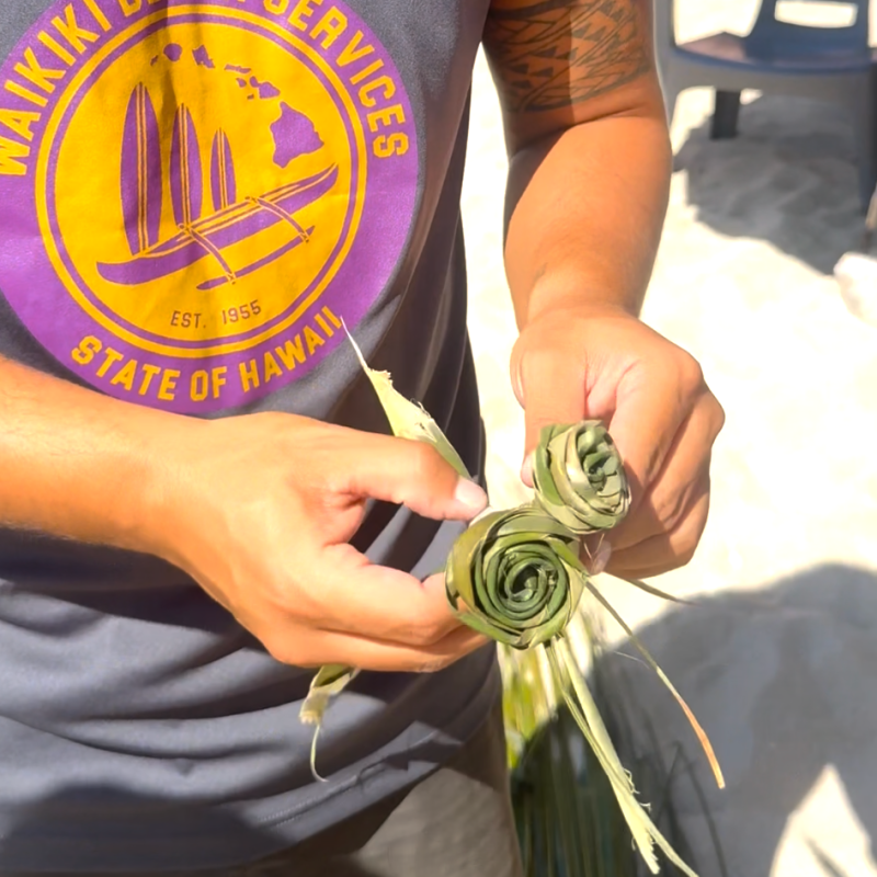 Under the Hawaiʻi sun, Beach Boy Rich gathered beachboys Diego, Koa, and Blaise close. Not to teach them how to read a set. Not to correct their paddle form. But to teach them how to fold and shape coconut leaves into lokelani (roses) made from lau niu (coconut palm leaf).