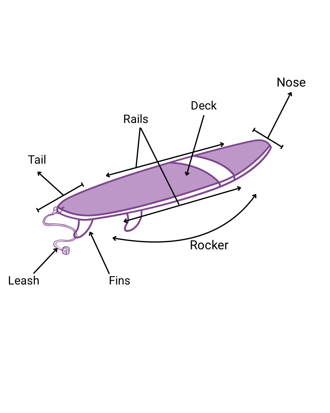 Deck: This is the top surface of the board, where you’ll be standing. Soft-top boards have a foam surface that’s easier on your feet and knees – and more forgiving if you wipe out!